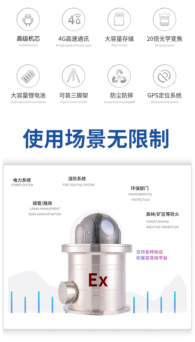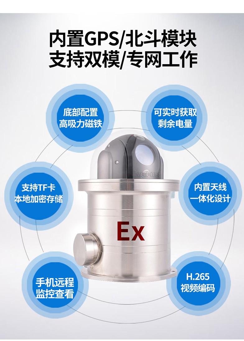 友聯哨兵5G防爆布控球是一款具備防爆功能的5G布控球產品,專為特定行業(如石油、煉化、化工、燃氣等危險化學和易燃易爆行業)設計。產品內置高清攝像機及高性能鋰電池組,通過5G等無線網絡方式回傳至控制終端,具備防水防震防爆等特性,攜帶便捷,可快速安裝和收納,完全滿足石油、化工等作業區的移動巡檢、無人值守、臨時監控、應急指揮的應用需求。